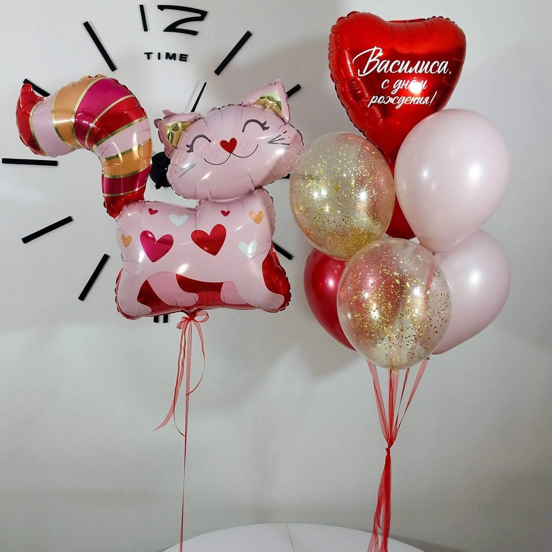Фонтан из 7 шаров (сердце с инд.надписью, 2 хрома красных, 2 шара с конфетти, 2 нежно розовых)