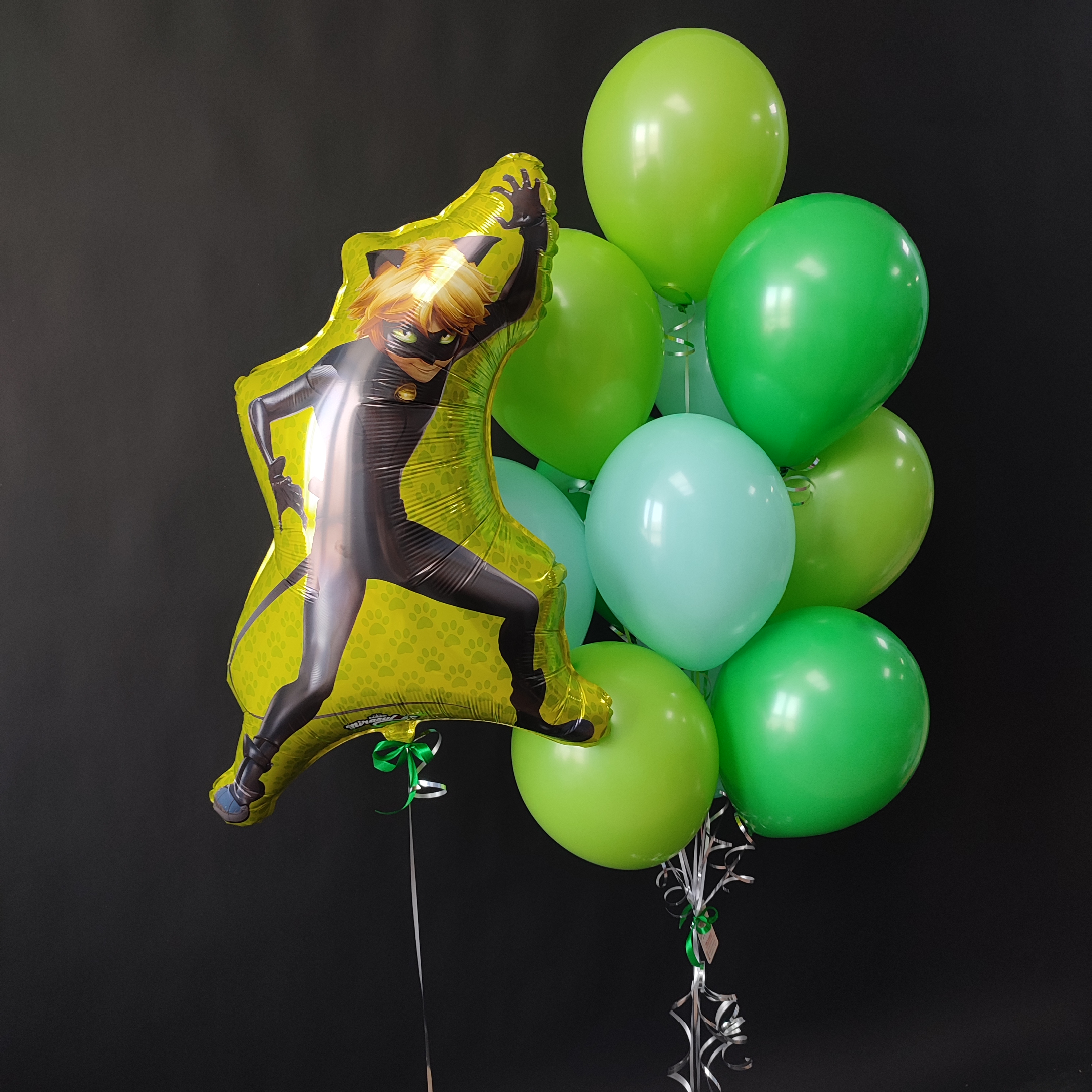 Фонтан из 11 шаров и фигура фольгированная Супер Кот